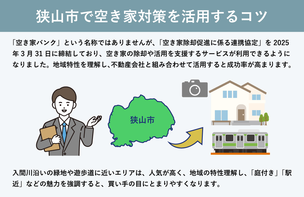 空き家バンク制度は、うまく使えば地域貢献と売却を両立できる仕組みです。しかし「登録だけで安心」は禁物。修繕や情報発信を怠らず、不動産会社と併用するなど工夫を加えることが成功へのポイントです。狭山市でも「空き家バンク」という名称ではないものの、自治体が積極的に空き家対策を行なっています。ぜひ前向きに検討してみてください。