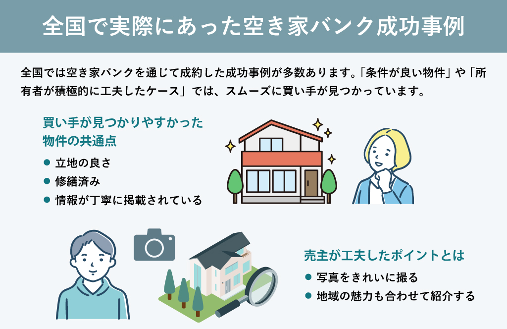 全国では空き家バンクを通じて成約した成功事例が多数あります。特に「条件が良い物件」や「所有者が積極的に工夫したケース」では、スムーズに買い手が見つかっています。ここではその共通点を見てみましょう。