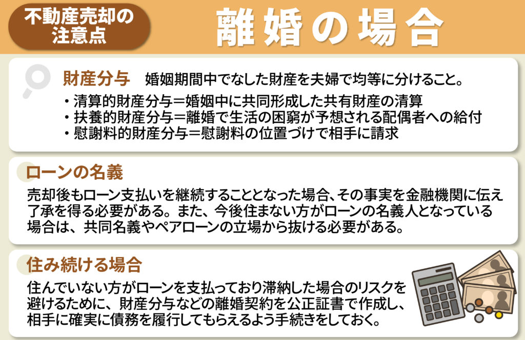 離婚にともなう売却でおもに注意すべき点は、財産分与と名義の2つです。