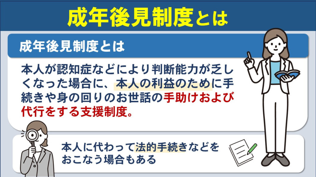 成年後見制度とは、本人が認知症や精神疾患などにより判断能力が乏しくなった場合に、本人の利益のために手続きや身の回りのお世話の手助けおよび代行をする支援制度です。