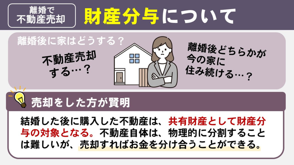 理由として、不動産売却するのか、あるいは離婚後どちらかが今の家に住み続けるのかという2つの選択肢があるからです。
