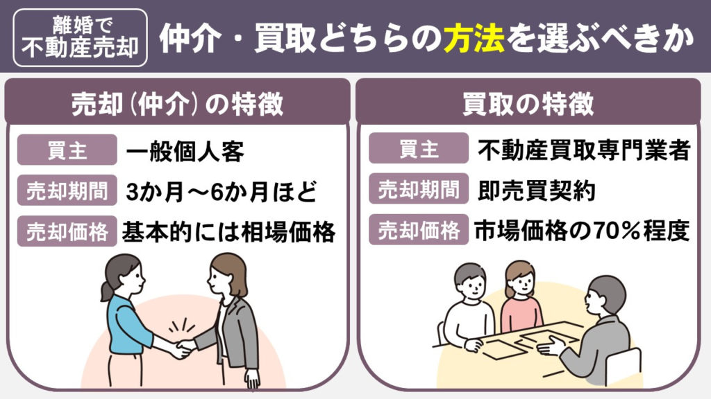 離婚後に不動産売却するという場合には不動産会社に仲介をしてもらうということと、不動産買取専門業者などに直接買い取ってもらう2つの方法があります。
