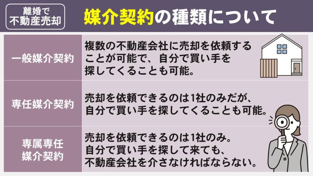 不動産売却する場合には依頼主は不動産会社と媒介契約を締結する必要があり、媒介契約の種類は次のとおりです。