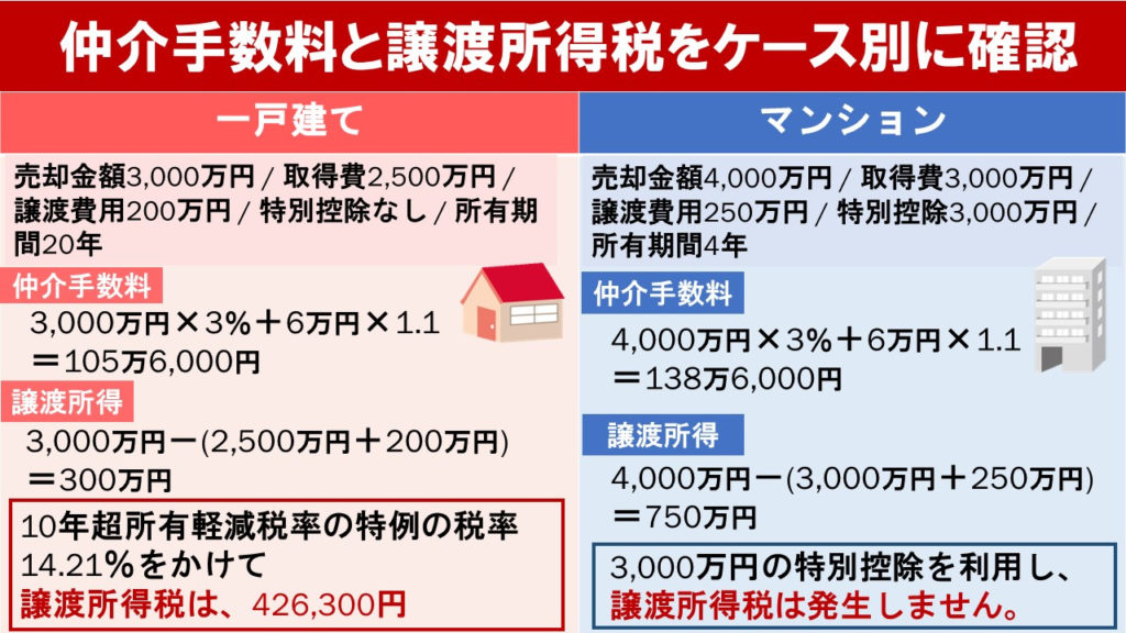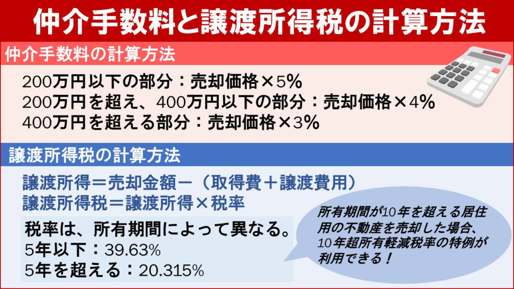 今回は、不動産売却時に発生する費用のなかでも高額になりやすい「仲介手数料」と「譲渡所得税」の計算方法について解説しました。