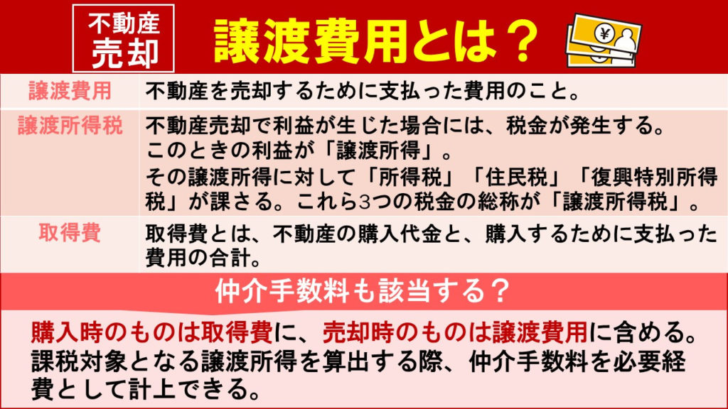 譲渡所得を算出する際には、不動産の売却金額から取得費と譲渡費用を差し引くことができ、その両方に仲介手数料が含まれます。