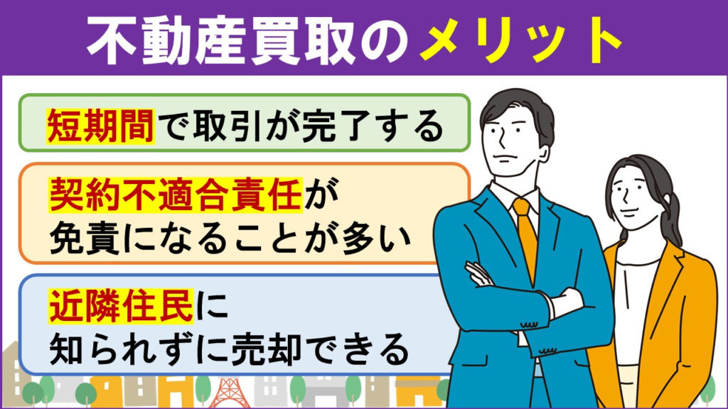 広告を出して販売活動をしたり、購入希望者に直接物件を見せたりする必要がないため、現金化までの期間を短縮できるという特徴があります。