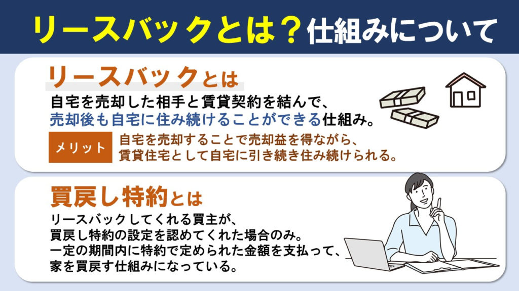 • リースバックとは、自宅を売却した相手と賃貸契約を結んで、売却後も自宅に住み続けることができる仕組み