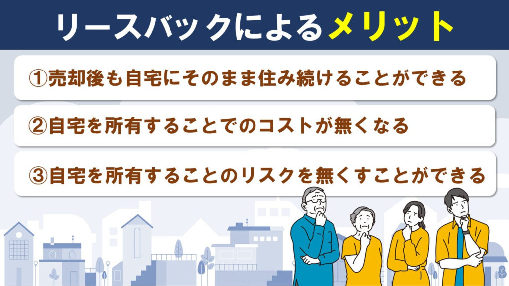 • リースバックのメリットは売却後も自宅に住み続けながら、所有するコストとリスクを無くすことが出来る