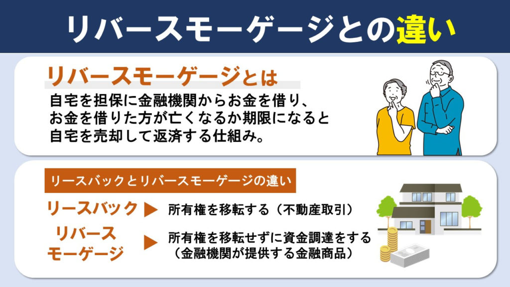 リースバックに似た仕組みにリバーバスモーゲージがありますが、所有権が移転するかしないかという大きな違いがあります。