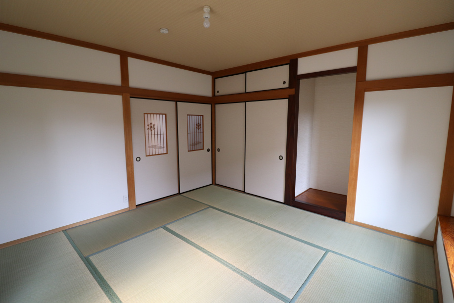 こちらの物件は、全部の床フロアタイル、全室クロス張替、トイレ・洗面所はクッションフロア張替、在来お風呂→ユニットバスへ新規交換、トイレ交換、洗面化粧台交換、畳表替え、襖・障子張替、スイッチ・コンセント交換、シーリング交換、全ドアノブ交換、一部窓枠塗装、一部窓枠ダイノックシート貼り、ハウスクリーニング、カースペース並列2台分の新規土間打ち外構工事等を行い、ほぼフルリフォーム工事の物件でした。