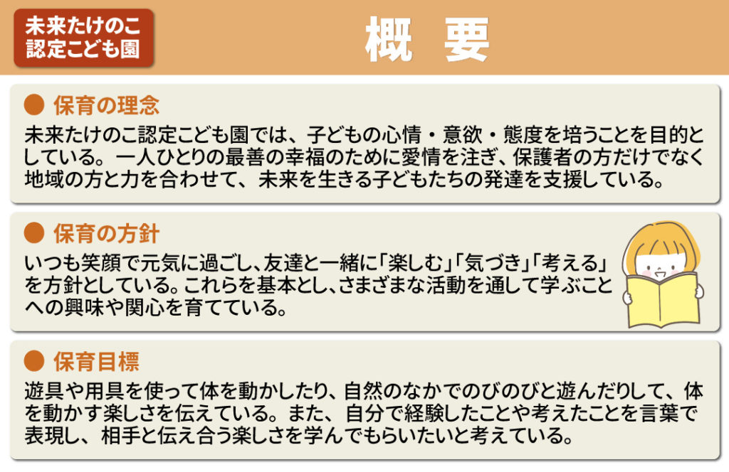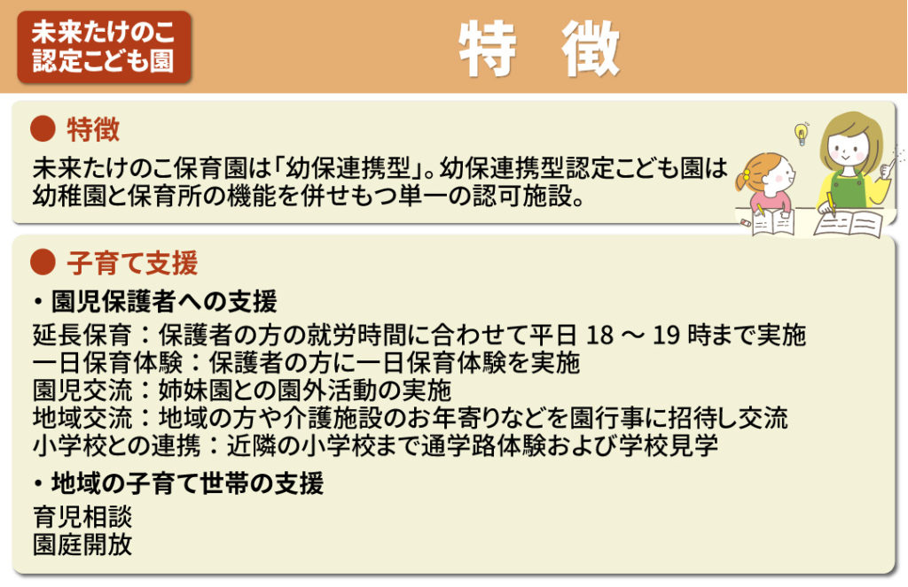 続いて、未来たけのこ認定こども園ならではの園の特徴や子育て支援についてご紹介します。