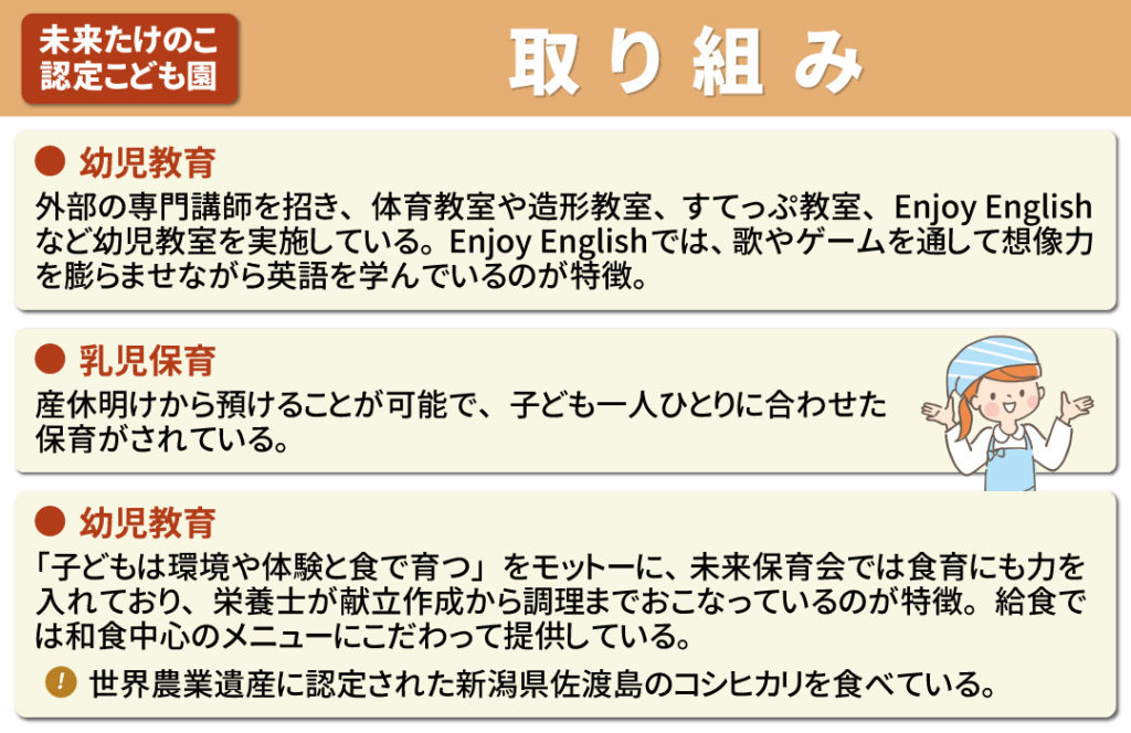 未来たけのこ認定こども園の教育・保育の主な内容は以下の3つです。