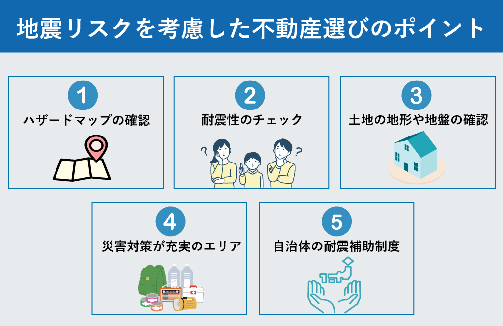 地震リスクを踏まえて不動産を選ぶ際には、以下の点を意識することが重要です。