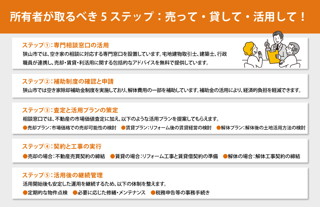 専門家の活用:狭山市の相談窓口や補助制度を積極的に活用し、専門的なアドバイスを受けながら進めましょう。