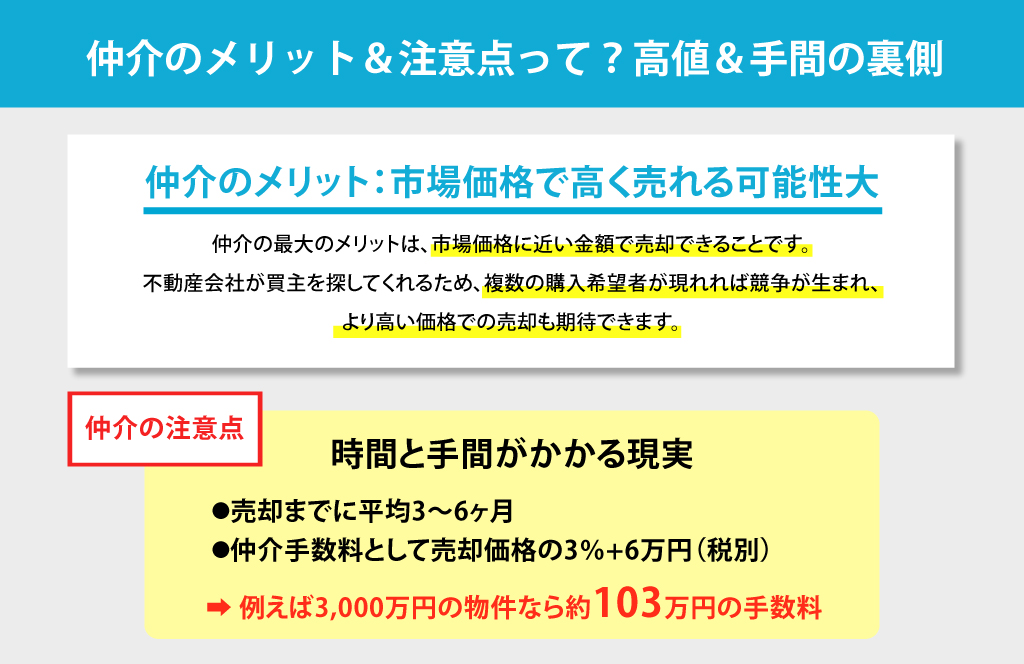 しかし、仲介には注意点もあります。売却までに平均3~6ヶ月かかり、内覧対応や価格交渉が必要です。また、仲介手数料として売却価格の3%+6万円(税別)が必要になります。例えば3,000万円の物件なら約103万円の手数料です。
