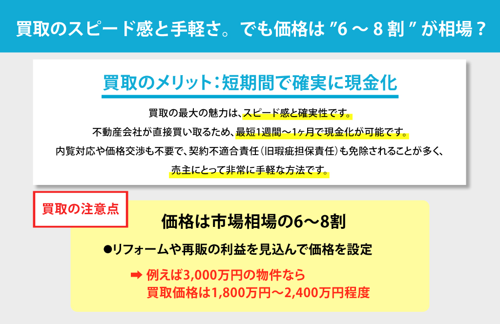 買取の最大の魅力は、スピード感と確実性です。不動産会社が直接買い取るため、最短1週間~1ヶ月で現金化が可能です。内覧対応や価格交渉も不要で、契約不適合責任(旧瑕疵担保責任)も免除されることが多く、売主にとって非常に手軽な方法です。