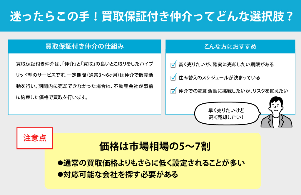買取保証付き仲介は、「仲介」と「買取」の良いとこ取りをしたハイブリッド型のサービスです。一定期間(通常3~6ヶ月)は仲介で販売活動を行い、期間内に売却できなかった場合は、不動産会社が事前に約束した価格で買取を行います。
