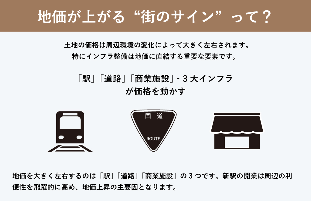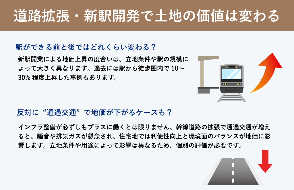 土地の価格は周辺環境の変化によって大きく左右されます。特にインフラ整備は地価に直結する重要な要素です。