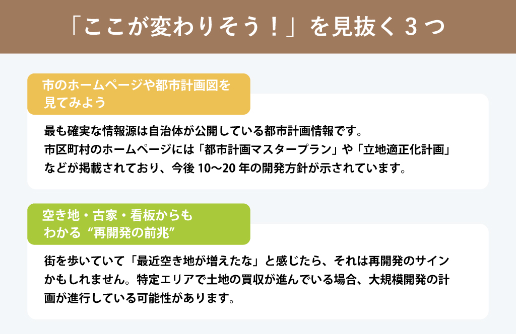 特に大手不動産会社やゼネコンの看板が立ちはじめたら、具体的な開発段階に入っている可能性が高いでしょう。日頃から地域を観察する習慣が大切です。