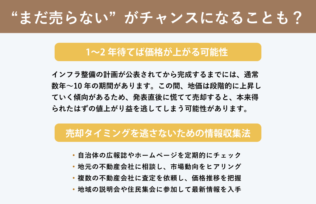 インフラ整備の計画を知ったとき、すぐに売却するのが正解とは限りません。状況によっては、あえて売却を待つことで大きなメリットが得られることもあります。