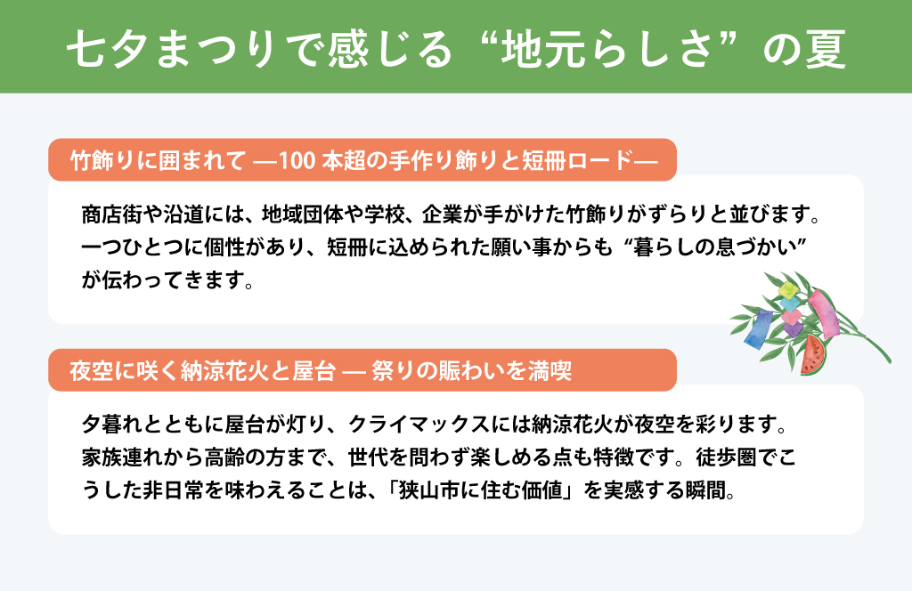 「この街、なんだか居心地がいい」——狭山市を訪れた方や、実際に暮らす方からよく聞く言葉です。その理由の一つが、地域に根づいた祭りやマルシェなどのイベント。入間川七夕まつりをはじめ、四季折々に開催される行事は、人と人を自然につなぎ、“住む街”としての魅力を育んでいます。