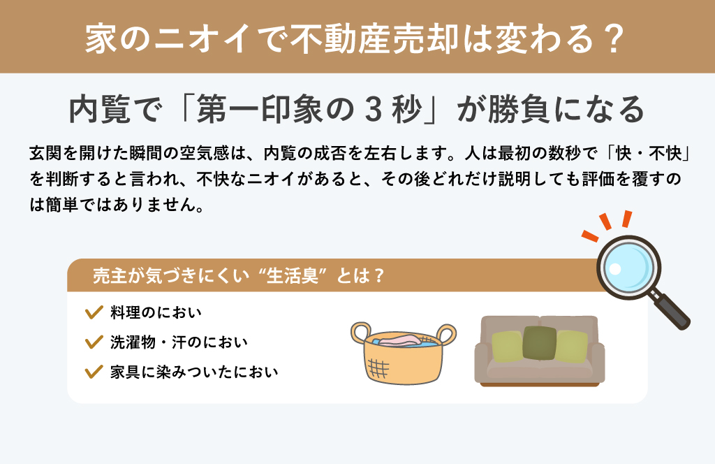 内覧では、設備や広さだけでなく「ここで気持ちよく暮らせそうか」が総合的に見られます。その判断を大きく左右するのが、視覚よりも先に届く“ニオイ”です。売主にとっては日常の一部でも、買主にとっては強い印象として残るポイントになります。