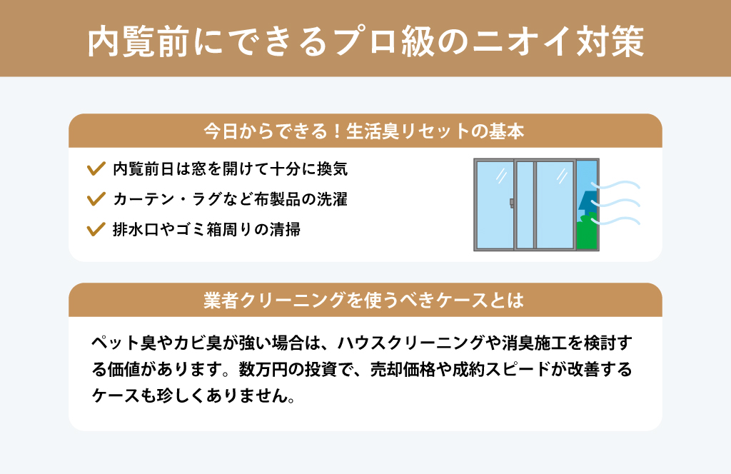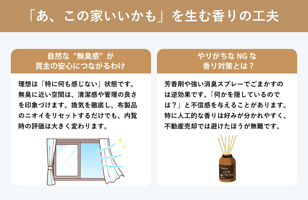 ニオイ対策の目的は、良い香りを漂わせることではありません。大切なのは、買主が違和感なく空間を受け入れられる状態をつくることです。自然な印象が安心感につながります。