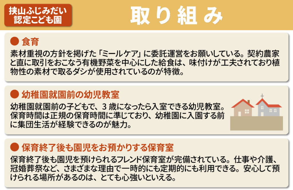 最後に、狭山ふじみだい認定こども園の取り組みについて解説します。
