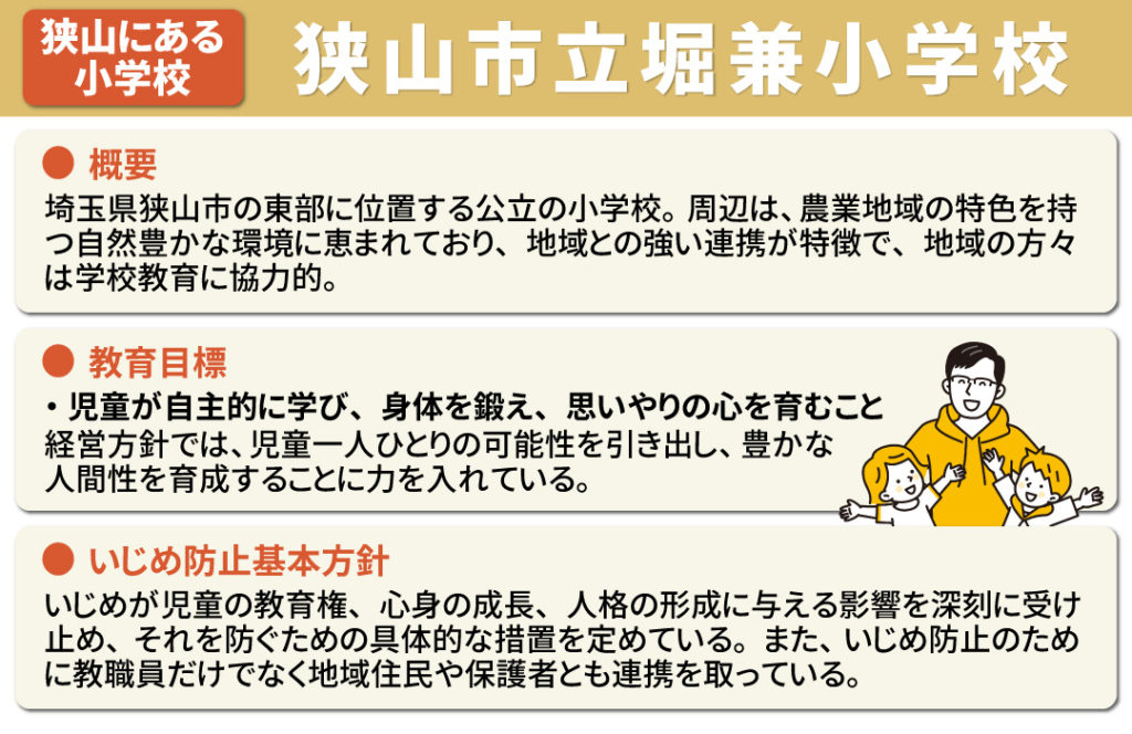 また、狭山市立堀兼小学校では、いじめ防止のために、教職員だけでなく地域住民や保護者とも連携を取り、問題の克服に向けた取り組みをおこなっています。