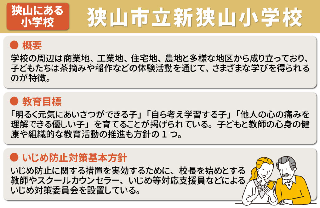狭山市立新狭山小学校では、教育目標として「明るく元気にあいさつができる子」「自ら考え学習する子」「他人の心の痛みを理解できる優しい子」を育てることが掲げられています。