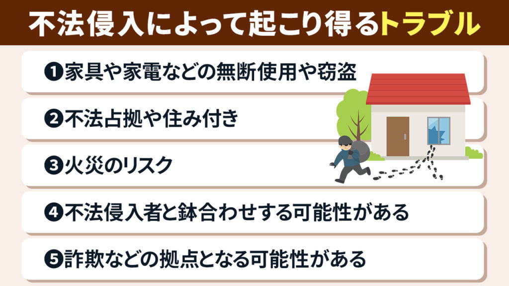 長期間家主が不在の場合、不法侵入後にそのまま住み付いてしまう可能性があります。