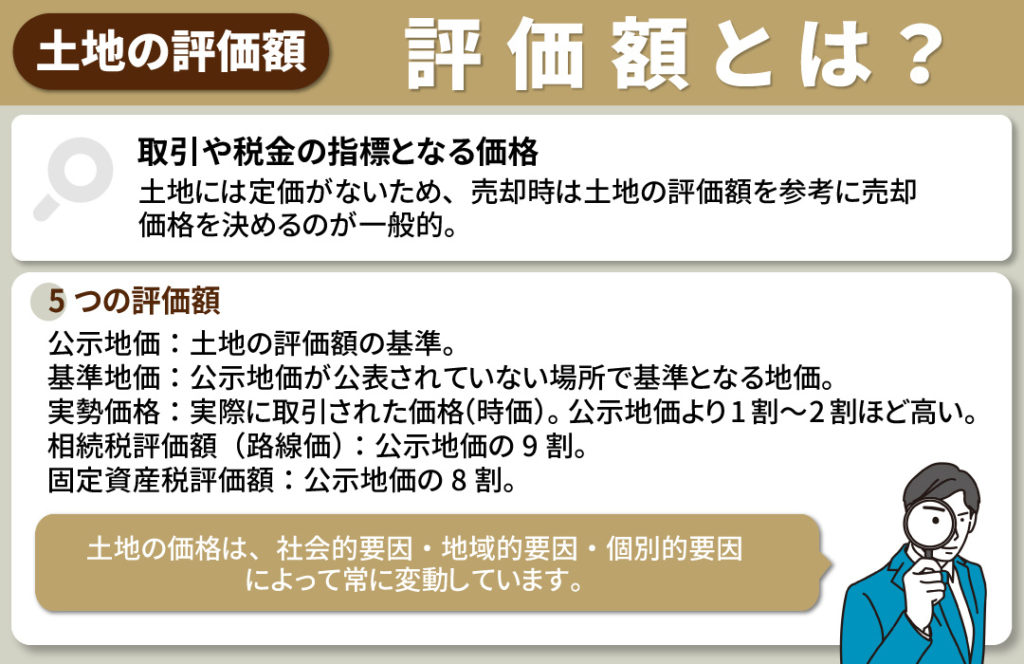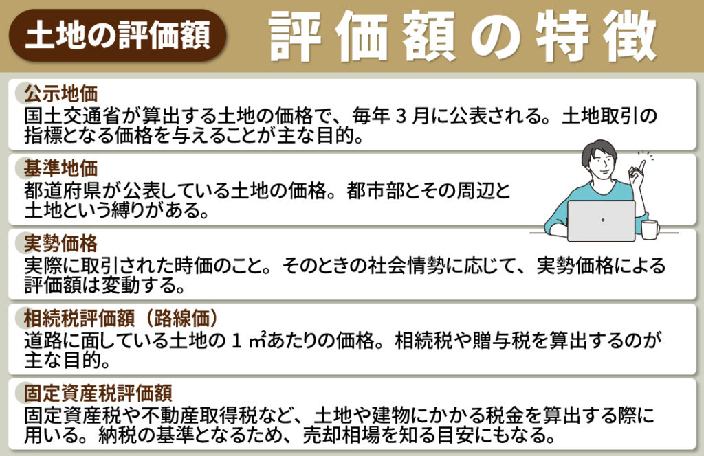 続いて、土地における5つの評価額の特徴を解説します。