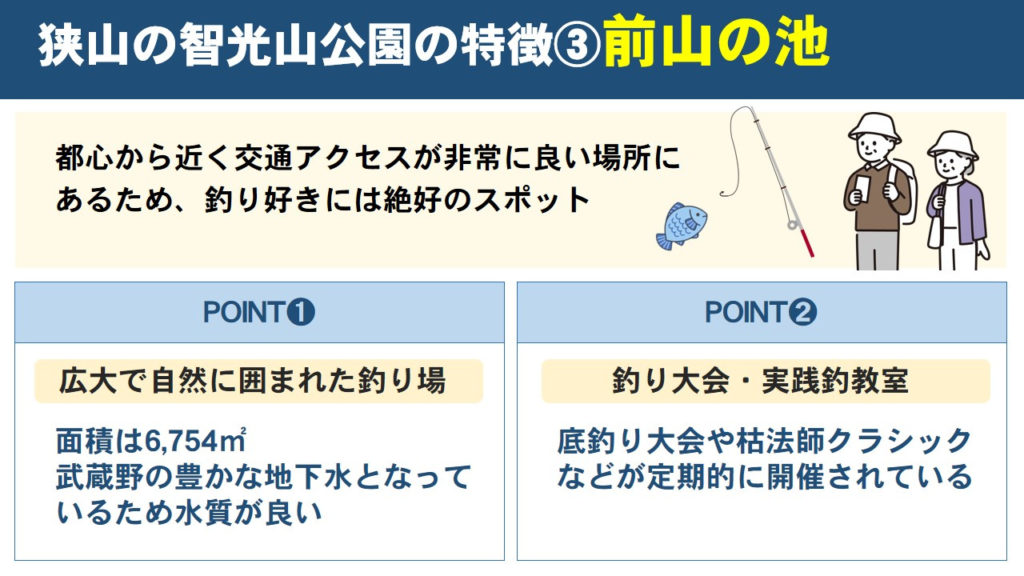 狭山の智光山公園には、ヘラブナ釣場として有名な「前山の池」があります。