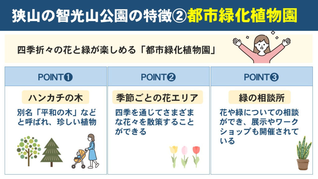 狭山の智光山公園には、四季折々の花と緑が楽しめる「都市緑化植物園」があります。
