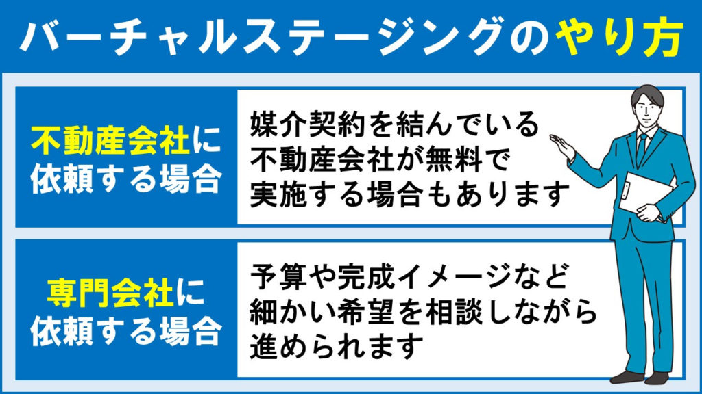 不動産会社に依頼する方法と、バーチャルステージングの専門会社に依頼する方法です。