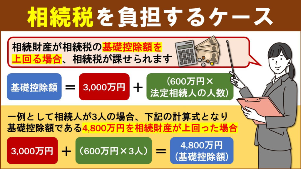 3,000万円+(600万円×3人)=4,800万円つまりこの4,800万円を相続財産が上回った場合に、相続税が課せられることになるのです。