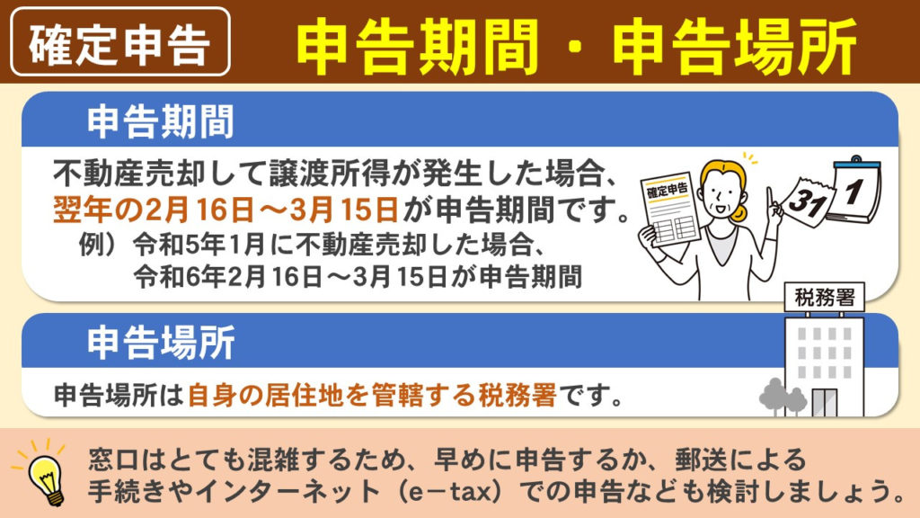 最後に、不動産売却における確定申告の申告期間や申告場所を解説します。