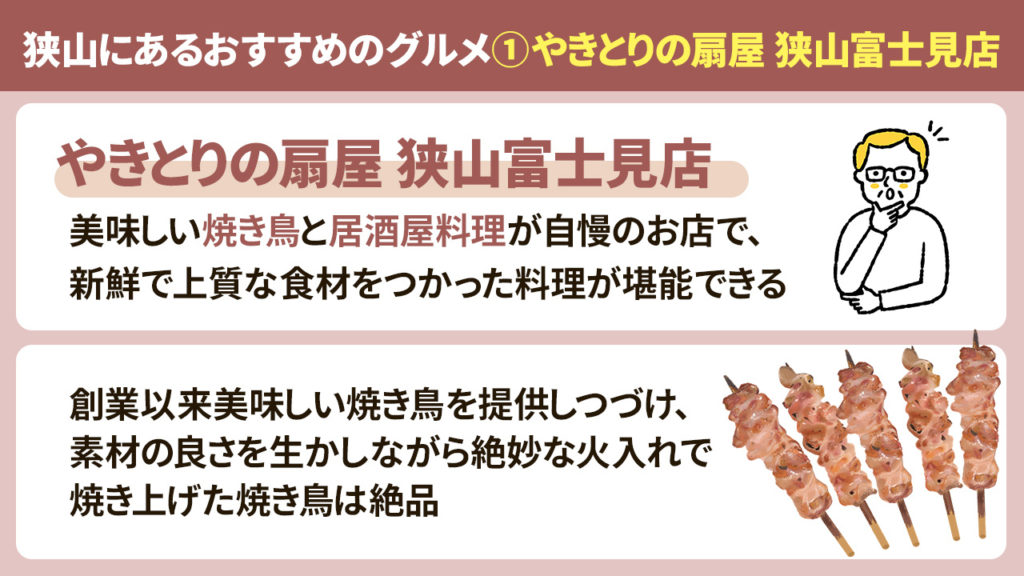そこで、今回は埼玉県狭山にあるおすすめグルメ「やきとりの扇屋 狭山富士見店」「和牛炭火焼肉 あぶりえん」「狭山カレー工房 りとるほっと。」の3つのお店をご紹介します。