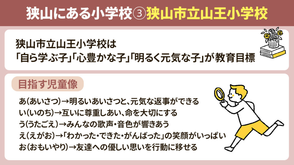 • 狭山市立山王小学校は「自ら学ぶ子」「心豊かな子」「明るく元気な子」が教育目標