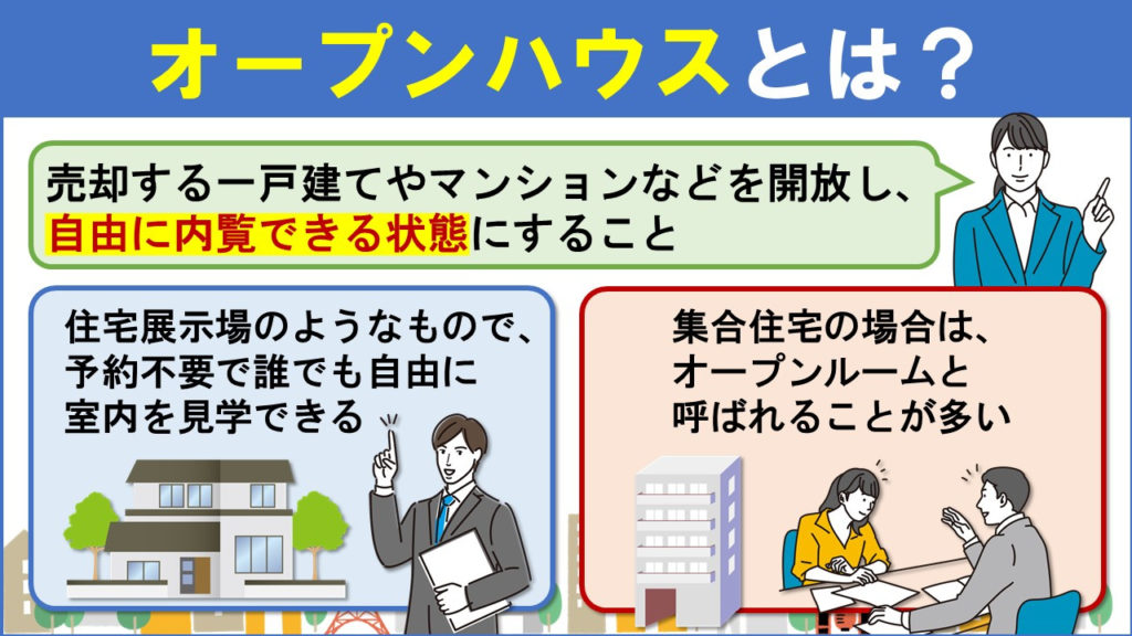 オープンハウスとは、売却する一戸建てやマンションなどを開放し、自由に内覧できる状態にすることです。