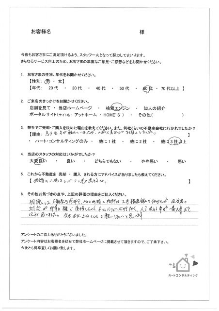 相続した不動産の売却で、他の地域は大手不動産会社に任せたが、担当者の対応が非常に雑で後悔したので、ネームバリューだけでなく、人で決めることが一番大事だと改めて思いました。次も是非上田さんにお願いしたいと思います。