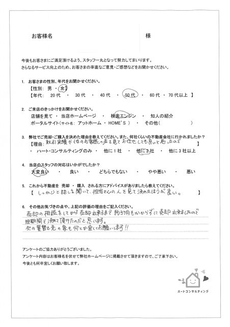 売却の相談をしてから売却出来るまで約3か月もかからずに売却出来ましたので短期間で決めて頂けたのだと思います。次の買い替え先の家も何とか宜しくお願いします!!